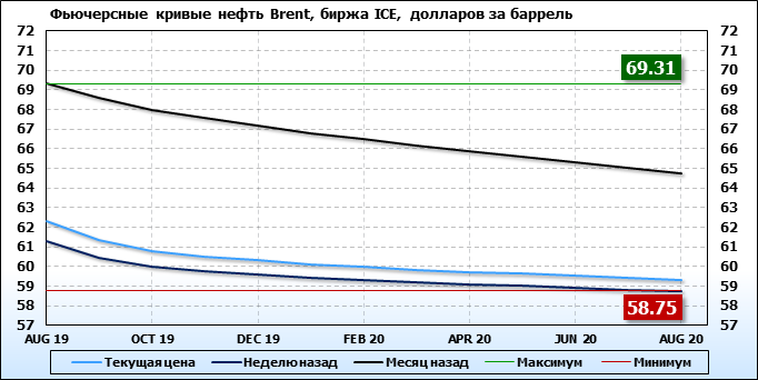 На 10.06.19 стоимость нефти марки Brent на бирже ICE по контракту AUG 19 составила 62.29 доллара за баррель. За прошедшую неделю стоимость нефти марки Brent выросла на 1.01 $/баррель. Как мы видим на графике, фьючерсная кривая имеет периоды, когда более дальний фьючерс дешевле ближнего. Состояние бэквардации наблюдаем на следующих контрактах: SEP 19; OCT 19; NOV 19; DEC 19; JAN 20; FEB 20; MAR 20; APR 20; MAY 20; JUN 20; JLY 20; AUG 20. Таким образом, трейдеры предполагают, что возможно превалирование предложения над спросом в указанные периоды, если рынок будет находиться на данных ценовых уровнях.