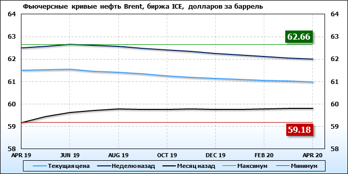 На 11.02.19 стоимость нефти марки Brent на бирже ICE по контракту APR 19 составила 61.51 доллара за баррель. За прошедшую неделю стоимость нефти марки Brent упала на 1 $/баррель. Как мы видим на графике, фьючерсная кривая имеет периоды, когда более дальний фьючерс дешевле ближнего. Состояние бэквардации наблюдаем на следующих контрактах: JLY 19; AUG 19; SEP 19; OCT 19; NOV 19; DEC 19; JAN 20; FEB 20; MAR 20; APR 20. Таким образом, трейдеры предполагают, что возможно превалирование предложения над спросом в указанные периоды, если рынок будет находиться на данных ценовых уровнях.