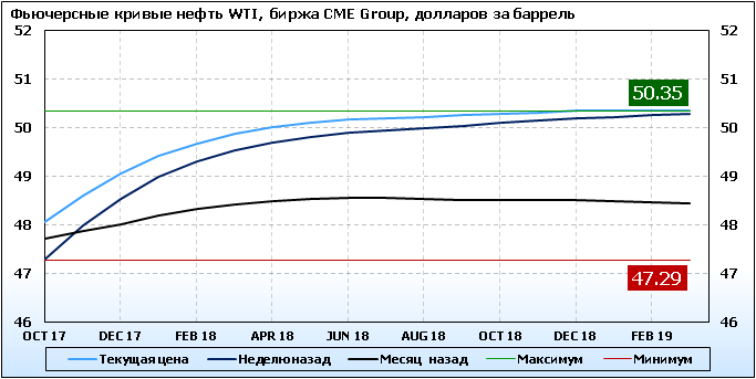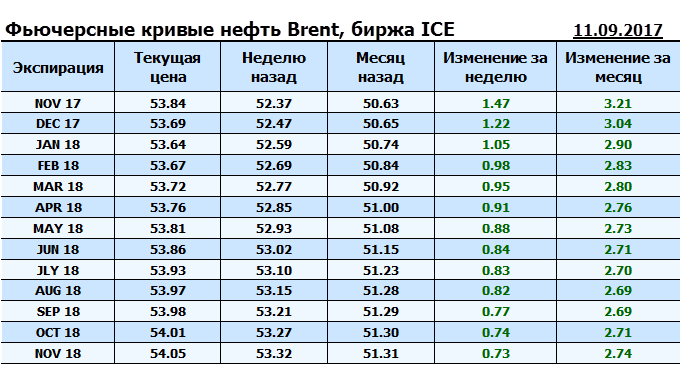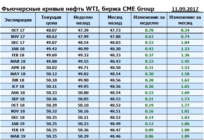 Фьючерсные кривые. Нефть. Биржи CME Group и ICE. Данные на 11.09.2017