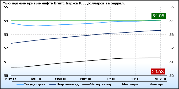 На 11.09.2017 стоимость нефти марки Brent на бирже ICE по контракту NOV 17 составила 53.84 доллара за баррель. За прошедшую неделю стоимость нефти марки Brent выросла на 1.47 $/баррель. Как мы видим, на графике, фьючерсная кривая имеет периоды, когда более дальний фьючерс дешевле ближнего. Состояние бэквардации наблюдаем на следующих контрактах: DEC 17; JAN 18. Таким образом, трейдеры предполагают, что возможно превалирование предложения над спросом в указанные периоды, если рынок будет находиться на данных ценовых уровнях.