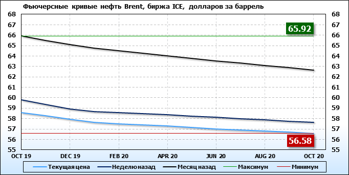 На 12.08.19 стоимость нефти марки Brent на бирже ICE по контракту OCT 19 составила 58.57 доллара за баррель. За прошедшую неделю стоимость нефти марки Brent упала на 1.24 $/баррель. Как мы видим на графике, фьючерсная кривая имеет периоды, когда более дальний фьючерс дешевле ближнего. Состояние бэквардации наблюдаем на следующих контрактах: NOV 19; DEC 19; JAN 20; FEB 20; MAR 20; APR 20; MAY 20; JUN 20; JLY 20; AUG 20; SEP 20; OCT 20. Таким образом, трейдеры предполагают, что возможно превалирование предложения над спросом в указанные периоды, если рынок будет находиться на данных ценовых уровнях.