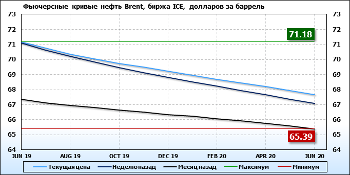 На 15.04.19 стоимость нефти марки Brent на бирже ICE по контракту JUN 19 составила 71.18 доллара за баррель. За прошедшую неделю стоимость нефти марки Brent выросла на 0.08 $/баррель. Как мы видим на графике, фьючерсная кривая имеет периоды, когда более дальний фьючерс дешевле ближнего. Состояние бэквардации наблюдаем на следующих контрактах: JLY 19; AUG 19; SEP 19; OCT 19; NOV 19; DEC 19; JAN 20; FEB 20; MAR 20; APR 20; MAY 20; JUN 20. Таким образом, трейдеры предполагают, что возможно превалирование предложения над спросом в указанные периоды, если рынок будет находиться на данных ценовых уровнях.