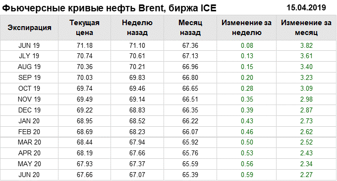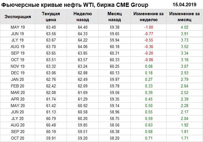 Фьючерсные кривые. Нефть. Биржи CME Group и ICE. Данные на 15.04.19