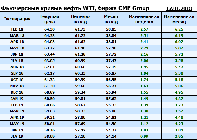 Фьючерсные кривые. Нефть. Биржи CME Group и ICE. Данные на 16.01.2018