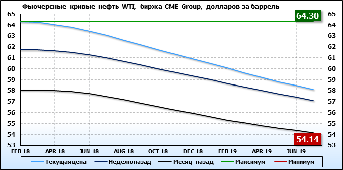 На 12.01.2018 стоимость нефти марки WTI на бирже CME Group по контракту FEB 18 составила 64.3 доллара за баррель. За прошедшую неделю стоимость нефти марки WTI выросла на 2.57 $/баррель. Как мы видим, на графике, фьючерсная кривая имеет периоды, когда более дальний фьючерс дешевле ближнего. Состояние бэквардации наблюдаем на следующих контрактах: MAR 18; APR 18; MAY 18; JUN 18; JLY 18; AUG 18; SEP 18; OCT 18; NOV 18; DEC 18; JAN 19; FEB 19; MAR 19; APR 19; MAY 19; JUN 19; JLY 19. Таким образом, трейдеры предполагают, что возможно превалирование предложения над спросом в указанные периоды, если рынок будет находиться на данных ценовых уровнях.