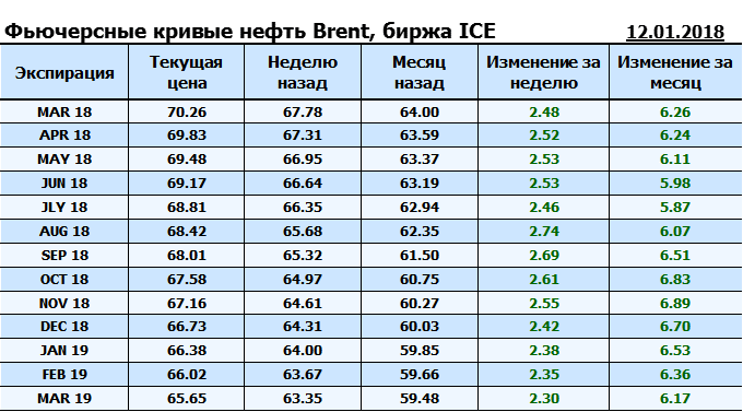 На 12.01.2018 стоимость нефти марки Brent на бирже ICE по контракту MAR 18 составила 70.26 доллара за баррель. За прошедшую неделю стоимость нефти марки Brent выросла на 2.48 $/баррель. Как мы видим, на графике, фьючерсная кривая имеет периоды, когда более дальний фьючерс дешевле ближнего. Состояние бэквардации наблюдаем на следующих контрактах: APR 18; MAY 18; JUN 18; JLY 18; AUG 18; SEP 18; OCT 18; NOV 18; DEC 18; JAN 19; FEB 19; MAR 19. Таким образом, трейдеры предполагают, что возможно превалирование предложения над спросом в указанные периоды, если рынок будет находиться на данных ценовых уровнях.