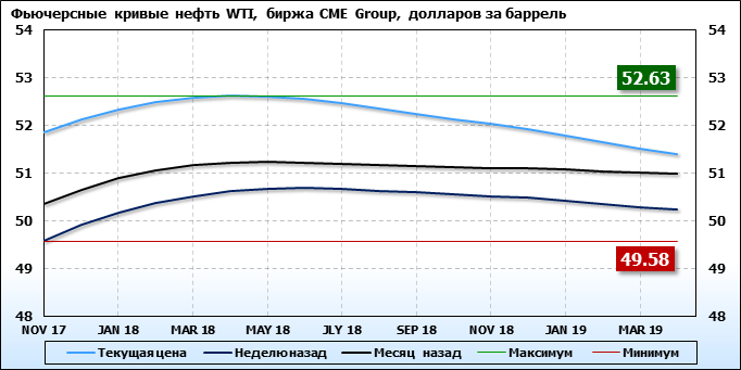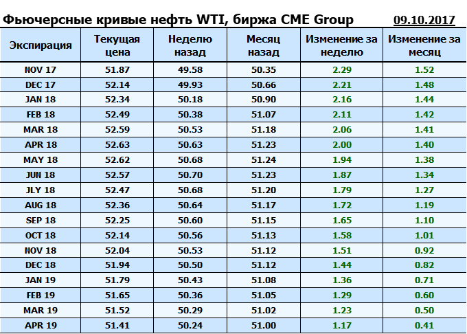 Фьючерсные кривые. Нефть. Биржи CME Group и ICE. Данные на 16.10.2017