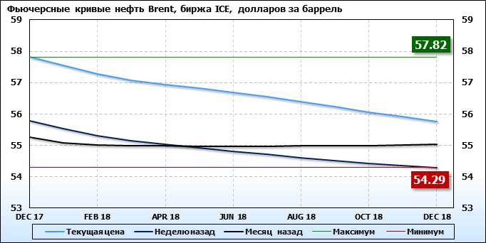 На 16.10.2017 стоимость нефти марки Brent на бирже ICE по контракту DEC 17 составила 57.82 доллара за баррель. За прошедшую неделю стоимость нефти марки Brent выросла на 2.03 $/баррель. Как мы видим, на графике, фьючерсная кривая имеет периоды, когда более дальний фьючерс дешевле ближнего. Состояние бэквардации наблюдаем на следующих контрактах: JAN 18; FEB 18; MAR 18; APR 18; MAY 18; JUN 18; JLY 18; AUG 18; SEP 18; OCT 18; NOV 18; DEC 18. Таким образом, трейдеры предполагают, что возможно превалирование предложения над спросом в указанные периоды, если рынок будет находиться на данных ценовых уровнях.