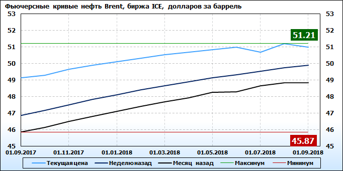 На 17.07.2017 стоимость нефти марки Brent на бирже ICE по контракту SEP 2017 составила 49.14 долларов за баррель. За прошедшую неделю стоимость нефти марки Brent выросла на 2.26 $/баррель. Как мы видим, на графике, фьючерсная кривая имеет периоды, когда более дальний фьючерс дешевле ближнего. Состояние бэквардации наблюдаем на следующих контрактах: JLY 2018; SEP 2018. Таким образом, трейдеры предполагают, что возможно превалирование предложения над спросом в указанные периоды.