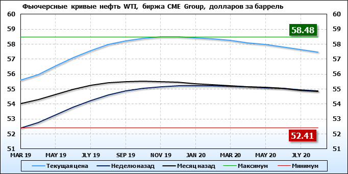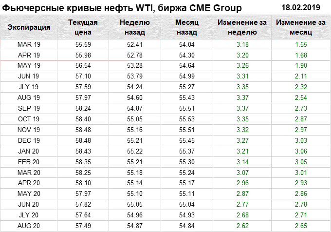 Фьючерсные кривые. Нефть. Биржи CME Group и ICE. Данные на 18.02.19