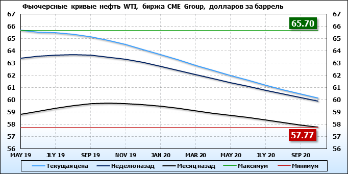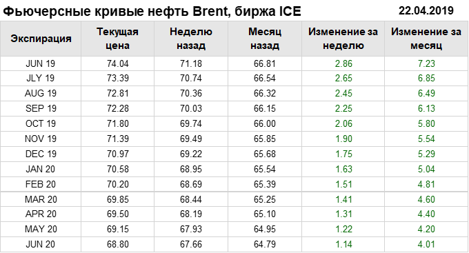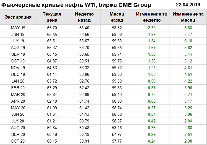 Фьючерсные кривые. Нефть. Биржи CME Group и ICE. Данные на 22.04.19