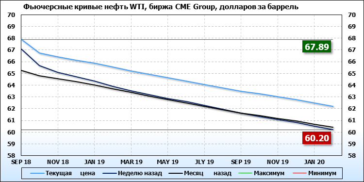 На 23.07.2018 стоимость нефти марки WTI на бирже CME Group по контракту SEP 18 составила 67.89 доллара за баррель. За прошедшую неделю стоимость нефти марки WTI выросла на 0.82 $/баррель. Как мы видим, на графике, фьючерсная кривая имеет периоды, когда более дальний фьючерс дешевле ближнего. Состояние бэквардации наблюдаем на следующих контрактах: OCT 18; NOV 18; DEC 18; JAN 19; FEB 19; MAR 19; APR 19; MAY 19; JUN 19; JLY 19; AUG 19; SEP 19; OCT 19; NOV 19; DEC 19; JAN 20; FEB 20. Таким образом, трейдеры предполагают, что возможно превалирование предложения над спросом в указанные периоды, если рынок будет находиться на данных ценовых уровнях.