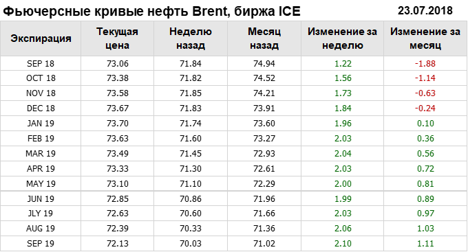 Фьючерсные кривые. Нефть. Биржи CME Group и ICE. Данные на 23.07.2018