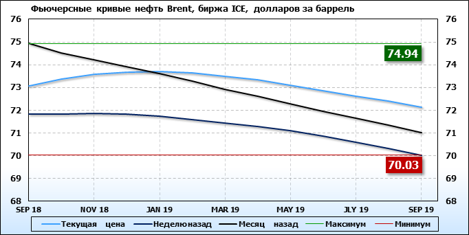На 23.07.2018 стоимость нефти марки Brent на бирже ICE по контракту SEP 18 составила 73.06 доллара за баррель. За прошедшую неделю стоимость нефти марки Brent выросла на 1.22 $/баррель. Как мы видим, на графике, фьючерсная кривая имеет периоды, когда более дальний фьючерс дешевле ближнего. Состояние бэквардации наблюдаем на следующих контрактах: FEB 19; MAR 19; APR 19; MAY 19; JUN 19; JLY 19; AUG 19; SEP 19. Таким образом, трейдеры предполагают, что возможно превалирование предложения над спросом в указанные периоды, если рынок будет находиться на данных ценовых уровнях.