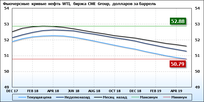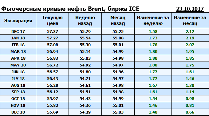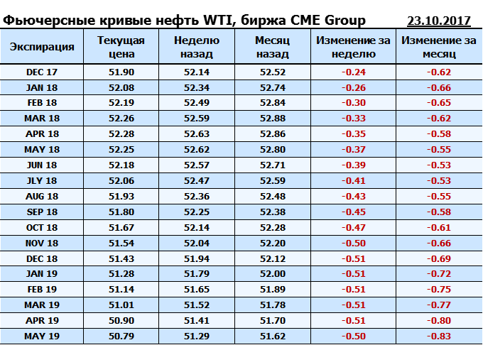 Фьючерсные кривые. Нефть. Биржи CME Group и ICE. Данные на 23.10.2017