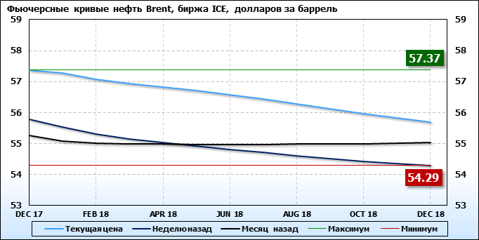 На 23.10.2017 стоимость нефти марки Brent на бирже ICE по контракту DEC 17 составила 57.37 доллара за баррель. За прошедшую неделю стоимость нефти марки Brent выросла на 1.58 $/баррель. Как мы видим, на графике, фьючерсная кривая имеет периоды, когда более дальний фьючерс дешевле ближнего. Состояние бэквардации наблюдаем на следующих контрактах: JAN 18; FEB 18; MAR 18; APR 18; MAY 18; JUN 18; JLY 18; AUG 18; SEP 18; OCT 18; NOV 18; DEC 18. Таким образом, трейдеры предполагают, что возможно превалирование предложения над спросом в указанные периоды, если рынок будет находиться на данных ценовых уровнях.
