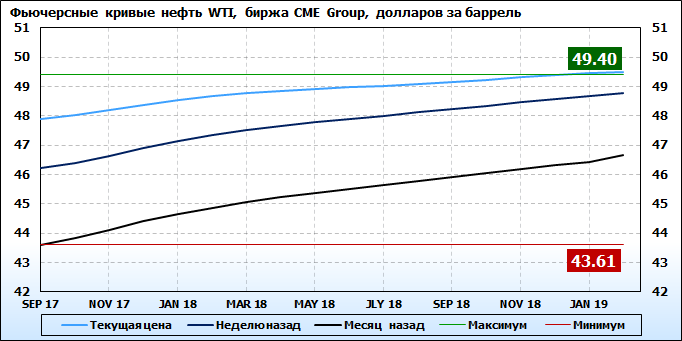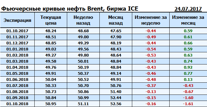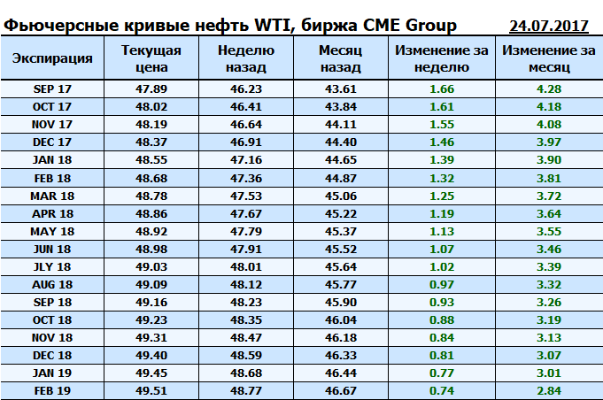 Фьючерсные кривые. Нефть. Биржи CME Group и ICE. Данные на 24.07.2017