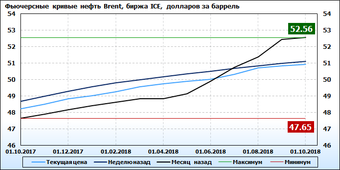 На 24.07.2017 стоимость нефти марки Brent на бирже ICE по контракту OCT 2017 составила 48.24 долларов за баррель. За прошедшую неделю (от понедельника к понедельнику) стоимость нефти марки Brent упала на 0.44 $/баррель. Как мы видим, на графике, фьючерсная кривая на всем своем протяжении находится в состоянии контанго. Трейдеры не ждут переизбытка предложения по текущим ценам.