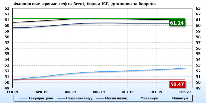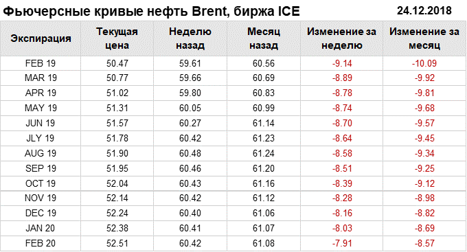 На 24.12.18 стоимость нефти марки Brent на бирже ICE по контракту FEB 19 составила 50.47 доллара за баррель. За прошедшую неделю стоимость нефти марки Brent упала на 9.14 $/баррель. Как мы видим на графике, фьючерсная кривая на всем своем протяжении находится в состоянии контанго.