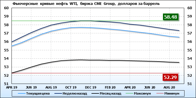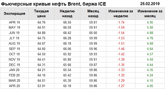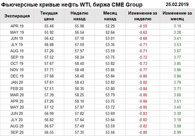 Фьючерсные кривые. Нефть. Биржи CME Group и ICE. Данные на 25.02.19