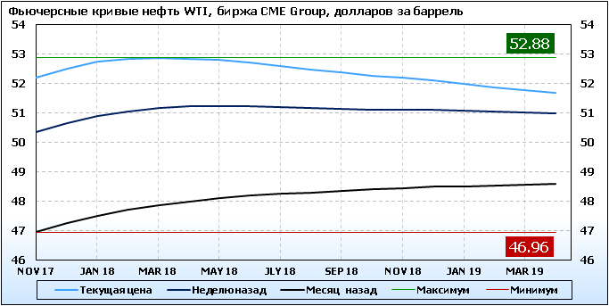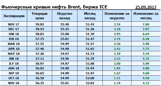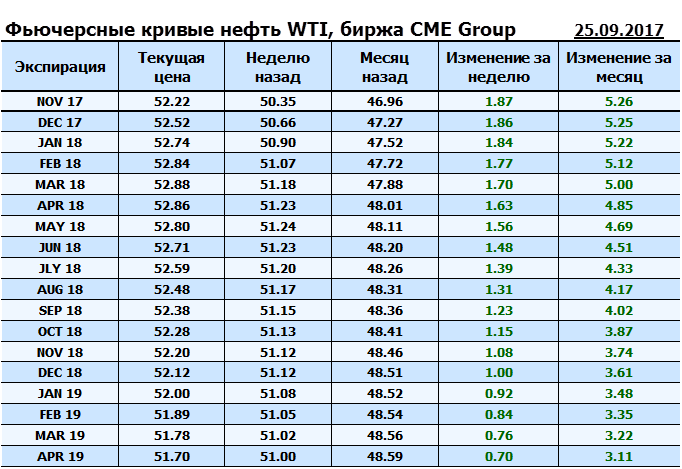 Фьючерсные кривые. Нефть. Биржи CME Group и ICE. Данные на 25.09.2017
