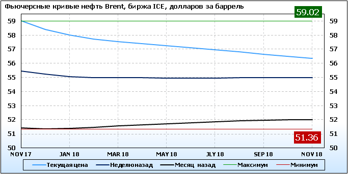 На 25.09.2017 стоимость нефти марки Brent на бирже ICE по контракту NOV 17 составила 59.02 доллара за баррель. За прошедшую неделю стоимость нефти марки Brent выросла на 3.54 $/баррель. Как мы видим, на графике, фьючерсная кривая имеет периоды, когда более дальний фьючерс дешевле ближнего. Состояние бэквардации наблюдаем на следующих контрактах: DEC 17; JAN 18; FEB 18; MAR 18; APR 18; MAY 18; JUN 18; JLY 18; AUG 18; SEP 18; OCT 18; NOV 18. Таким образом, трейдеры предполагают, что возможно превалирование предложения над спросом в указанные периоды, если рынок будет находиться на данных ценовых уровнях.