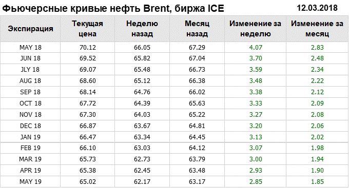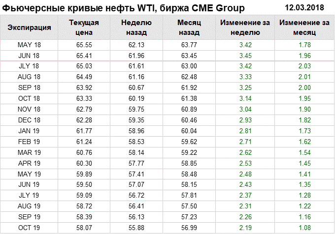 Фьючерсные кривые. Нефть. Биржи CME Group и ICE. Данные на 19.03.2018