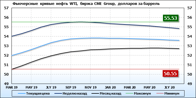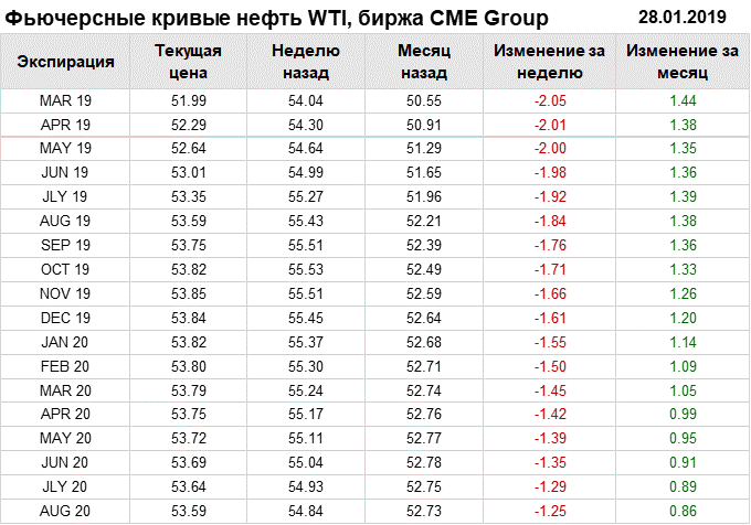 Фьючерсные кривые. Нефть. Биржи CME Group и ICE. Данные на 28.01.19