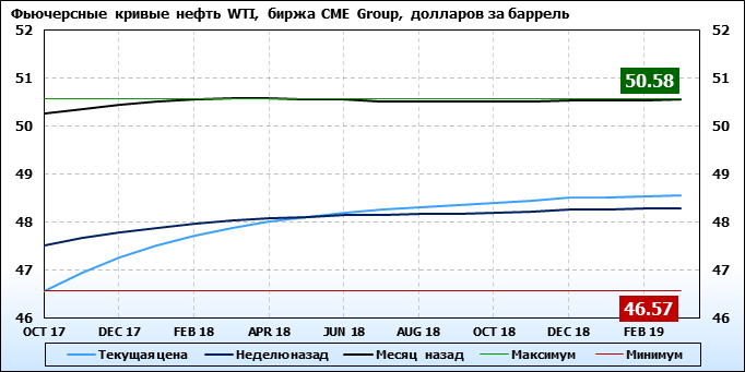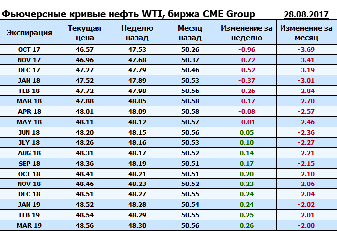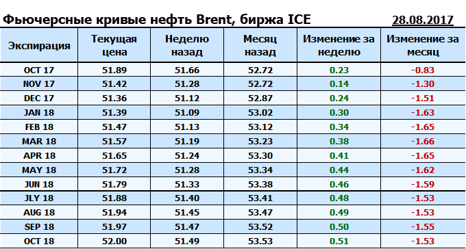 Фьючерсные кривые. Нефть. Биржи CME Group и ICE. Данные на 28.08.2017