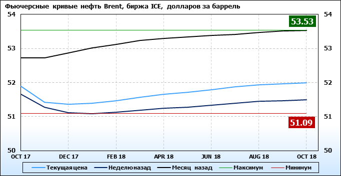 На 28.08.2017 стоимость нефти марки Brent на бирже ICE по контракту OCT 17 составила 51.89 доллара за баррель. За прошедшую неделю стоимость нефти марки Brent выросла на 0.23 $/баррель. Как мы видим, на графике, фьючерсная кривая имеет периоды, когда более дальний фьючерс дешевле ближнего. Состояние бэквардации наблюдаем на следующих контрактах: NOV 17; DEC 17. Таким образом, трейдеры предполагают, что возможно превалирование предложения над спросом в указанные периоды, если рынок будет находиться на данных ценовых уровнях.