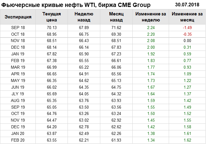 Фьючерсные кривые. Нефть. Биржи CME Group и ICE. Данные на 30.07.2018