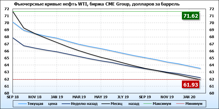 На 30.07.2018 стоимость нефти марки WTI на бирже CME Group по контракту SEP 18 составила 70.13 доллара за баррель. За прошедшую неделю стоимость нефти марки WTI выросла на 2.24 $/баррель. Как мы видим, на графике, фьючерсная кривая имеет периоды, когда более дальний фьючерс дешевле ближнего.