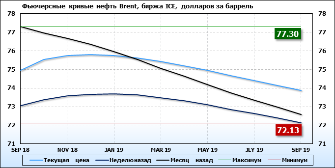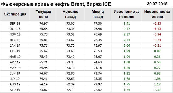 На 30.07.2018 стоимость нефти марки Brent на бирже ICE по контракту SEP 18 составила 74.97 доллара за баррель. За прошедшую неделю стоимость нефти марки Brent выросла на 1.91 $/баррель. Как мы видим, на графике, фьючерсная кривая имеет периоды, когда более дальний фьючерс дешевле ближнего.
