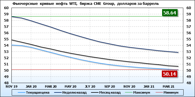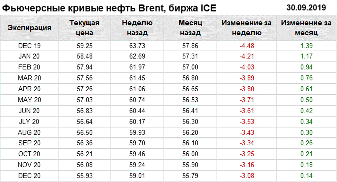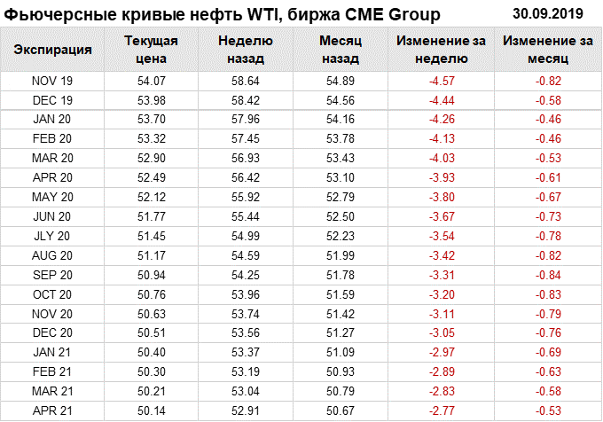 Фьючерсные кривые. Нефть. Биржи CME Group и ICE. Данные на 30.09.19