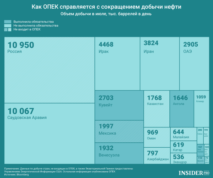 При этом по итогам июля Россия опередила Саудовскую Аравию по производству нефти, добывая в среднем по 10,95 млн баррелей в день (по сравнению с 10,067 млн у лидера ОПЕК).