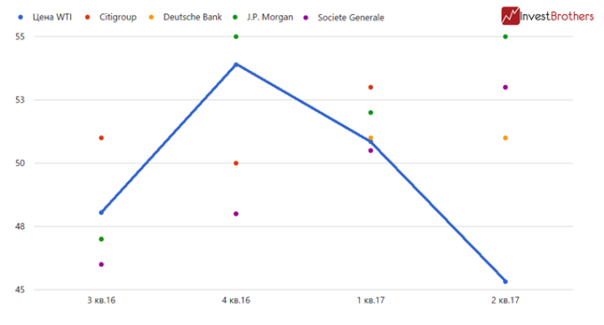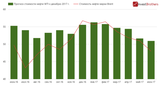 Отсутствие положительной динамики в росте стоимости нефти заставило пересмотреть инвестиционные банки свои прогнозы на конец года. Если в июне 2016 г. они ожидали, что ценам на нефть WTI удастся к декабрю 2017 г. добраться до 55,3 долларов за бочку, то сегодня они ждут их на уровне в 50,95 долларов. Не многим лучше прогноз на следующее лето – лишь 52,23 доллара за баррель.