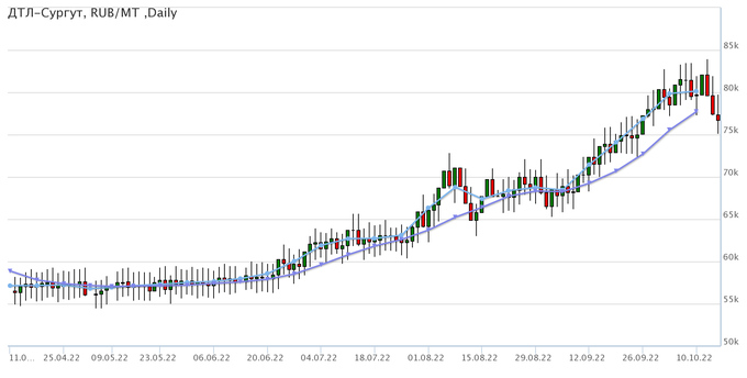 Цены на топливо дизельное ДТ-А-К5, базис поставки Ханты-Мансийский АО, снизились за неделю на 2881 рубль до 76703 рублей за тонну.