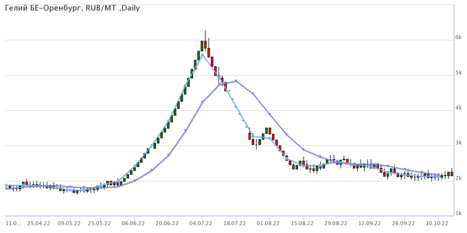 Цены на гелий газообразный, базис поставки Оренбургская область, выросли за неделю на 45 рублей до 2146 рублей за кубический метр.