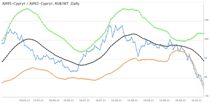 Разница цен между 95-м и 92-м бензином на базисе Сургут (Ханты-Мансийский а.о.).