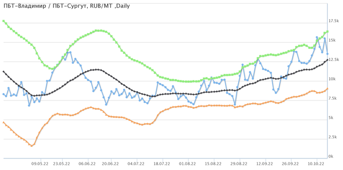 Разница цен между ПБТ на базисе Владимир и ПБТ на базисе Сургут (Ханты-Мансийский а.о.).