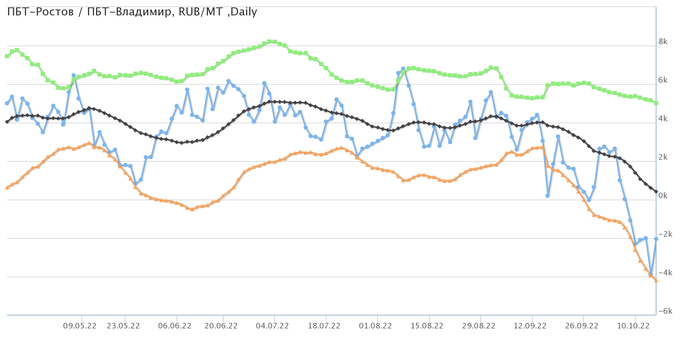 Разница цен между ПБТ на базисе Ростов и ПБТ на базисе Владимир.