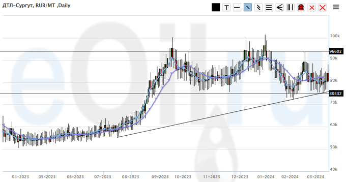Цены на топливо дизельное ДТ-А-К5, базис поставки Ханты-Мансийский АО, выросли за неделю на 1513 рубля до 80600 рублей за тонну.