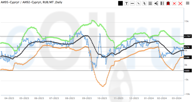 Разница цен между 95-м и 92-м бензином на базисе Сургут (Ханты-Мансийский а.о.).