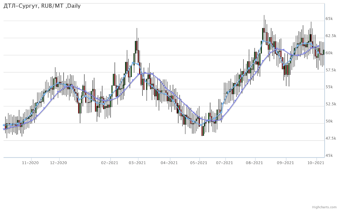 Цены на топливо дизельное ДТ-А-К5, базис поставки Ханты-Мансийский АО, выросли за неделю на 259 рублей до 61009 рублей за тонну.