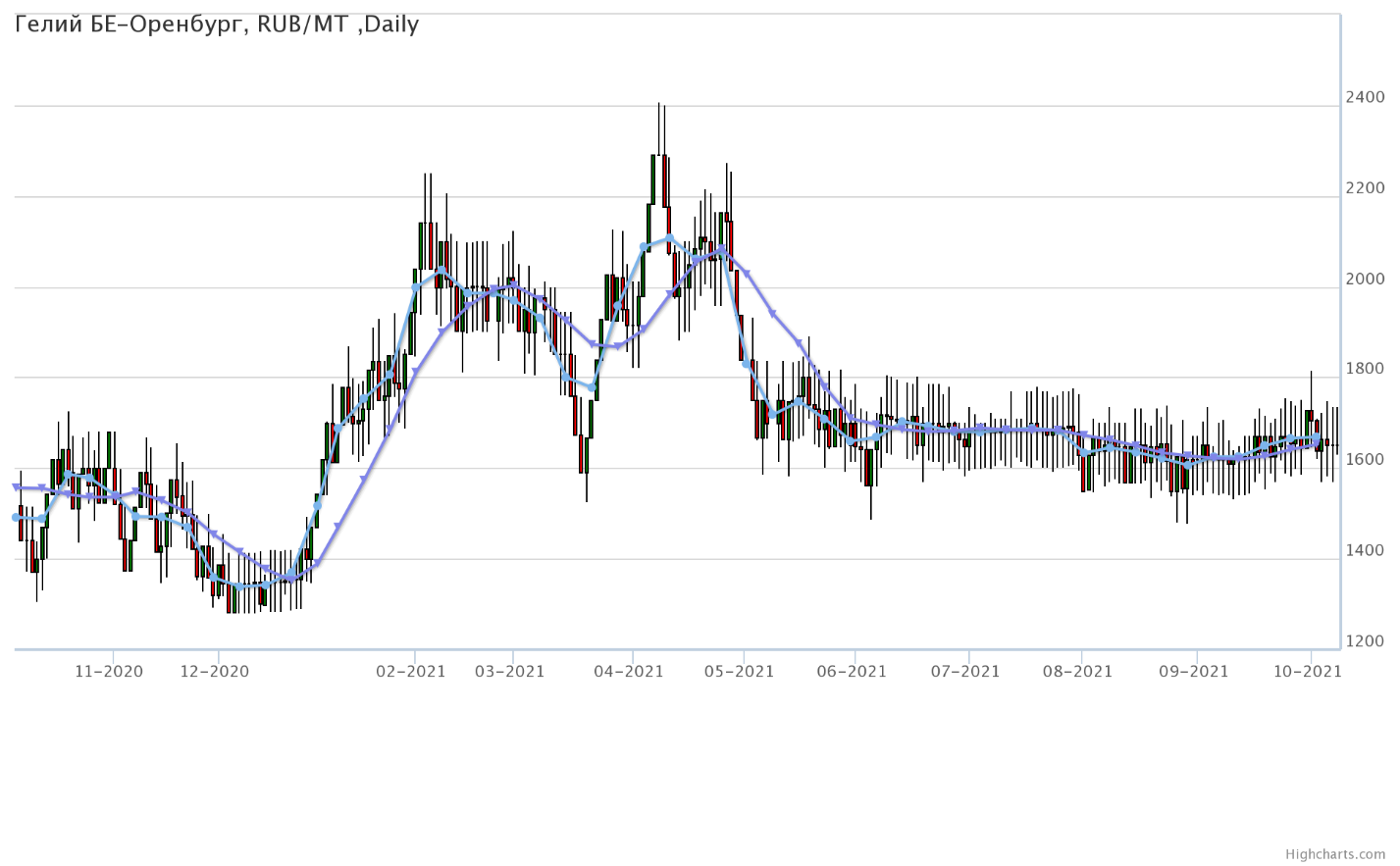 Цены на гелий газообразный, базис поставки Оренбургская область, выросли за неделю на 50 рублей до 1701 рубля за кубический метр.