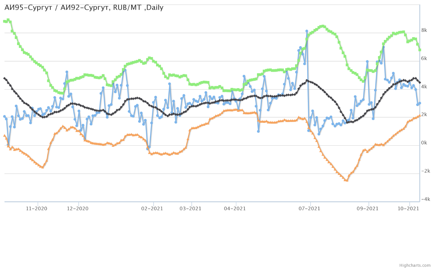 Разница цен между 95-м и 92-м бензином на базисе Сургут (Ханты-Мансийский а.о.).