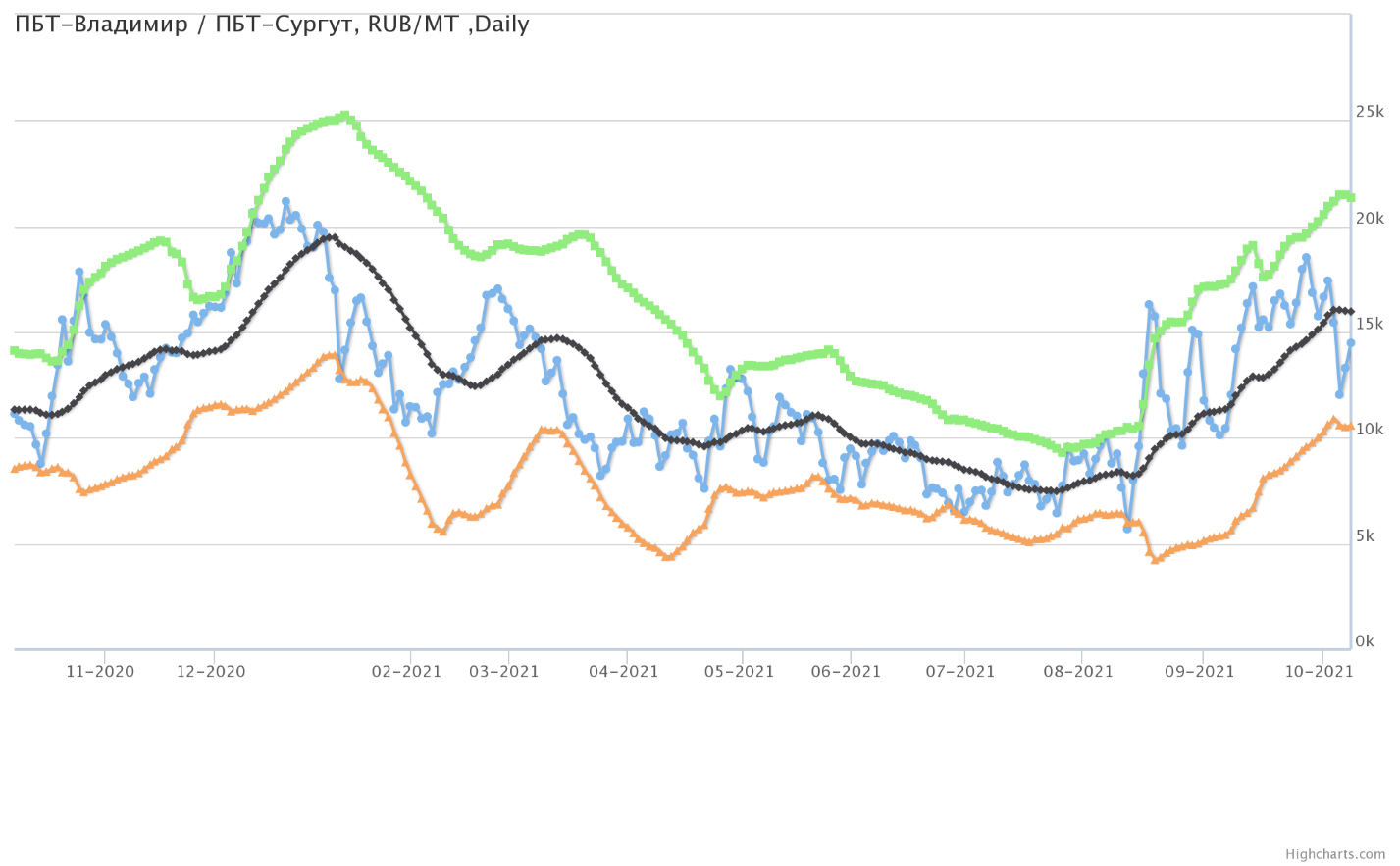 Разница цен между ПБТ на базисе Владимир и ПБТ на базисе Сургут (Ханты-Мансийский а.о.).