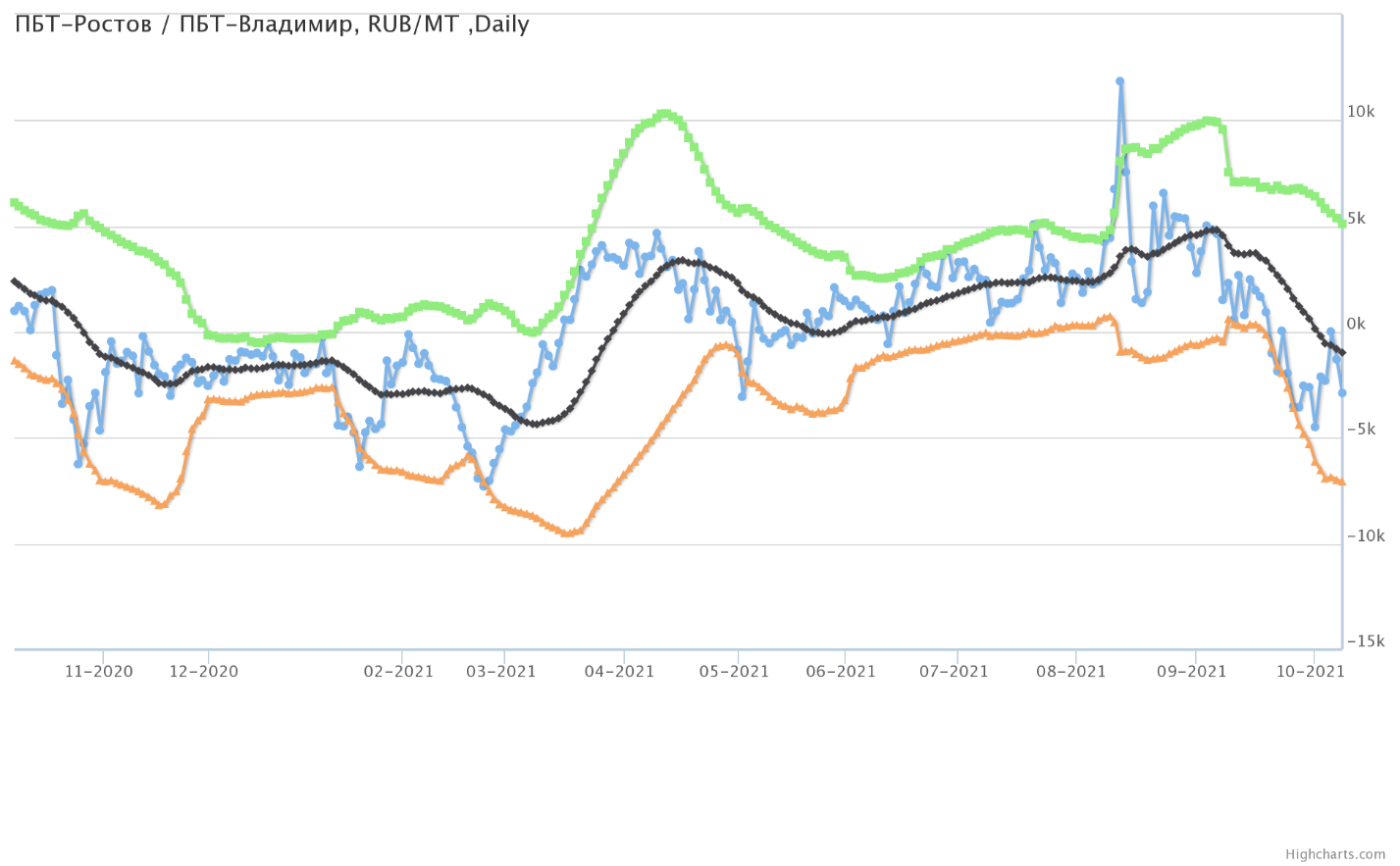 Разница цен между ПБТ на базисе Ростов и ПБТ на базисе Владимир.