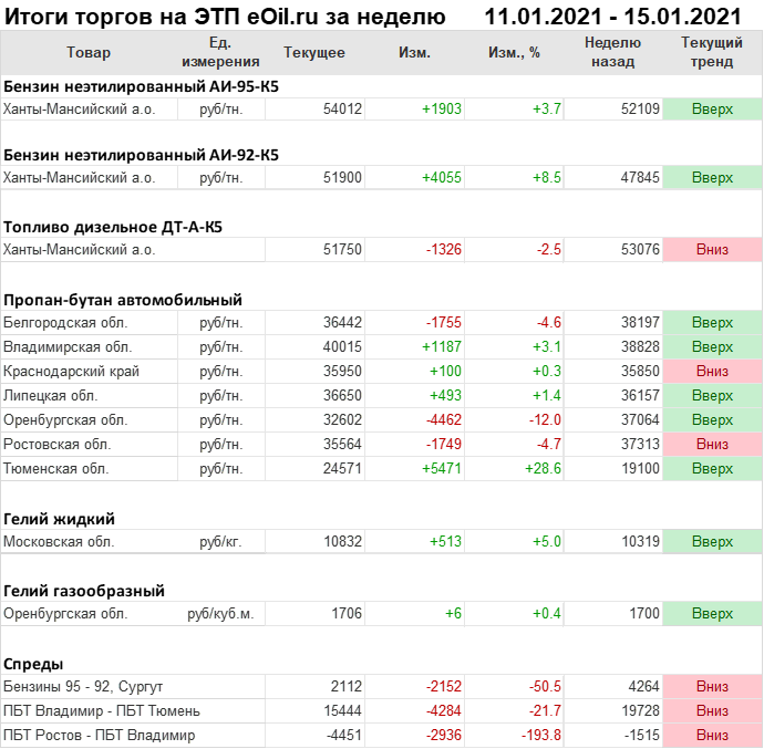 За прошедшую неделю в результате торгов на площадке eOil.ru были показаны следующие ценовые изменения: