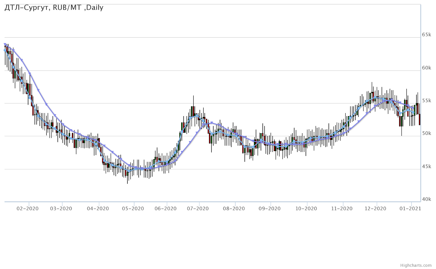 Цены на топливо дизельное ДТ-А-К5, базис поставки Ханты-Мансийский а.о., упали за неделю на 1326 рублей до 51750 рублей за тонну.